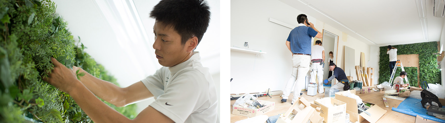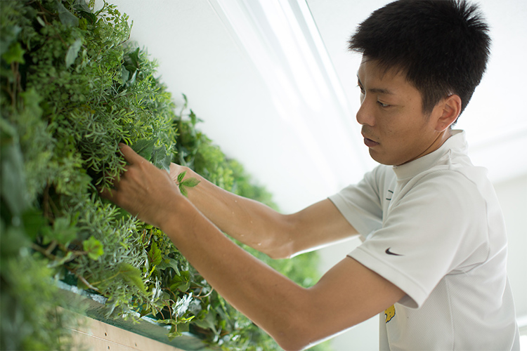 壁面緑化でクールな風景の中で落ち着く箇所を取り入れたり、